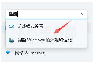 2、在左上方搜索框中搜索“性能”进入“调整 Windows 的外观和性能”。